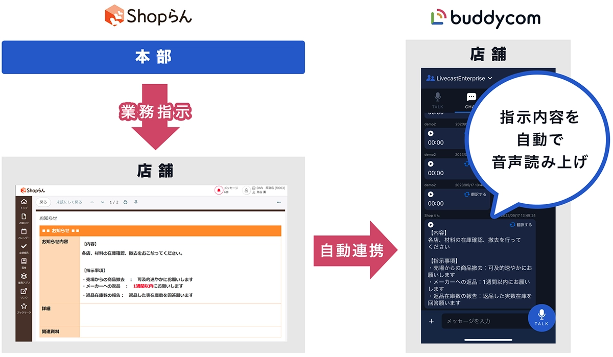 Shopらんで本部から店舗に送った業務指示をBuddycomが店舗内の従業員に音声で一斉に共有します。